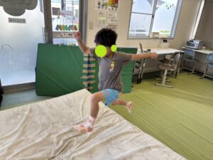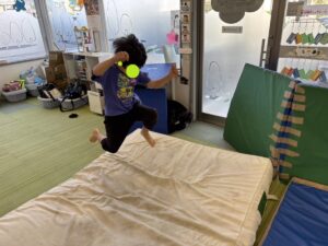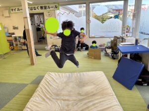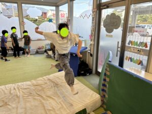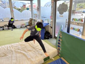今日は教室にある大きなマットでどれだけ跳べるかを競う遊びをしました。