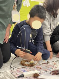 リース製作ではグルーガンも使用します。事前にグルーガンの注意事項をしっかりと説明し、安全に取り掛かっていきます。