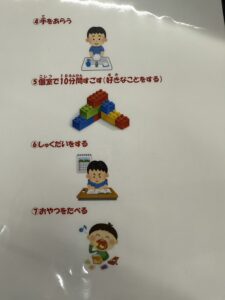 全体のスケジュールもありますが、学校帰りのすぐで疲れもあってなかなかうまく取り組めないお友達。その為、その子の特性に合わせて無理のないスケジュールをこちらで作りました。