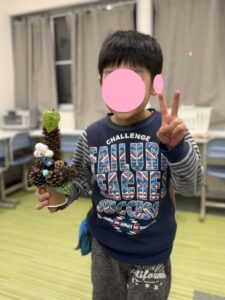 リース完成したお友達は松ぼっくりでツリーも制作しました。
