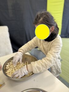 午前中は上映中に食べるポップコーンをみんなで作りました。何回も作っているのでみんな手慣れた手つきです。