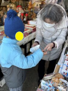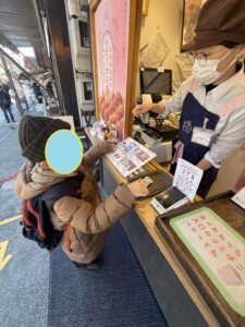 仲見世でおやつを買っている子もいました。おやつかおもちゃか1品買って良いルールだったのでみんな真剣に考えて決めていました。支払いも自分で行いました。
