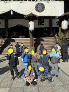 お参りした後にみんなで集合写真を撮りました。晴れていて初詣日和でした。