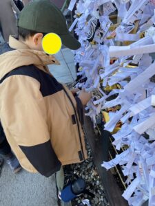 おみくじを引きました。本人としては思わしくない結果だったため境内のヒモに結びました。