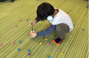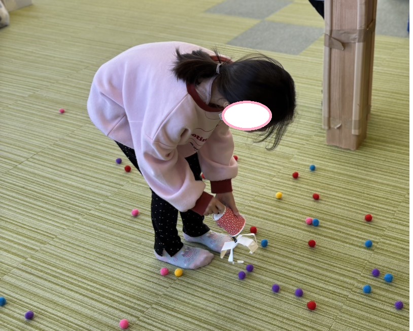 1分半の中で5個つかんだら普通のお菓子、10個で豪華お菓子、15個でさらに豪華菓子をゲットできます。最高で23個つかんだ子もいました