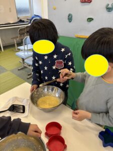 3回作っている子が初めて作る子に作り方を教えていました。教えあいも大事な療育です。