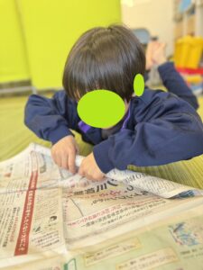 戦いごっこのために新聞紙で武器を作るお子さんも!