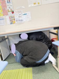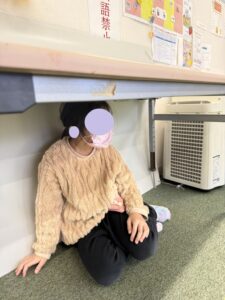 机の下に隠れて揺れがおさまるまで待ちます。