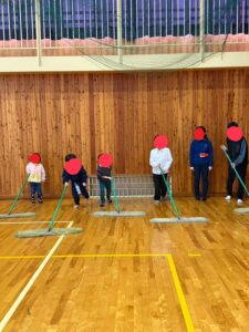 遊び終わった後はお友達でならんでもらいみんなでモップ掛け!