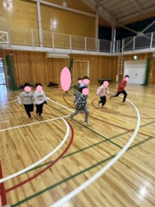 体育館内はまだ冷えている場所もあり、けが防止のためしっかりウォーミングアップをしてから遊びます。
