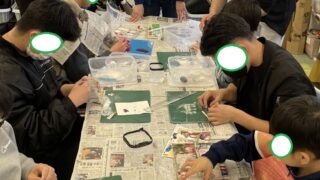 こんにちは。ひふみ吉田第2教室です。マグネット細工作りも後半に差し掛かり、色付けをする子が多くなりました。新聞紙のエプロンを着て絵具を塗って行きます。細かいところは綿棒を使って塗って行きます。新幹線の赤を塗っています。真剣に塗っています。ポ...